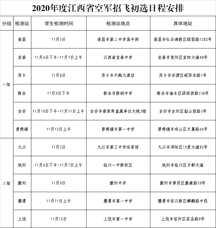 根據(jù)2020年度空軍招飛工作安排,11月5日至12日,空軍招飛局南京選拔中心將派初選組赴各地市,對(duì)報(bào)考空軍飛行學(xué)員的學(xué)生進(jìn)行檢測(cè),具體安排如下:溫馨提示初選檢測(cè)內(nèi)