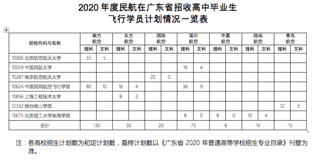 2020年度民航在廣東省招收高中畢業(yè)生飛行學員計劃情況一覽表
