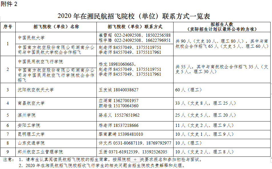 附2:2020年在湘民航招飛院校(單位)聯(lián)系方式一覽表