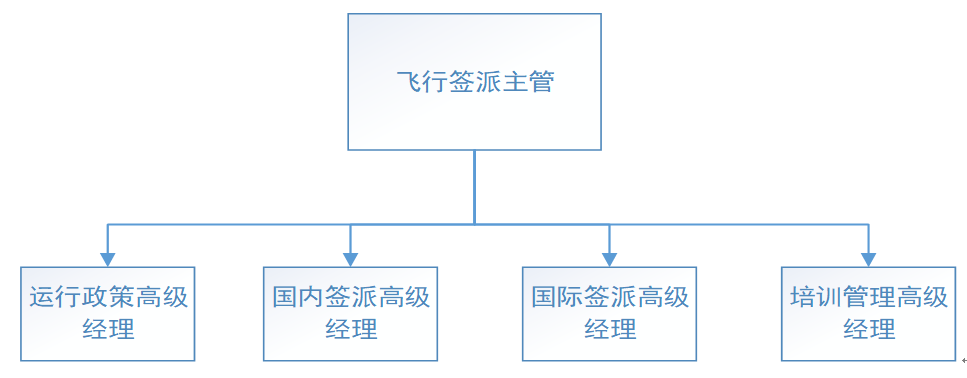 飛行簽派主管下設4名高級經(jīng)理分別負責運行政策、國內(nèi)運行、國際運行和培訓管理,還設置了導航數(shù)據(jù)庫、飛行簽派員訓練、MEL等崗位監(jiān)督管理人員若干人。