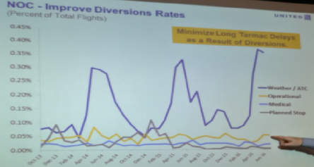 UA重點抓始發(fā)航班,制定了涵蓋公司各個部門的正常性指標,同時NOC將協(xié)同各樞紐和航站共同監(jiān)控航班運行的關鍵指標,協(xié)同解決運行不正常情況。定期分析航班改航備降的具體原因,主要關注由于天氣和空管原因?qū)е碌膫浣登闆r。