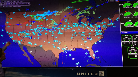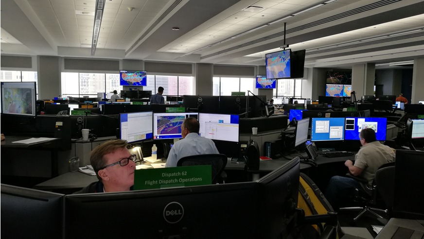 UA的網(wǎng)絡運行中心(NOC)位于芝加哥城區(qū)的Willis Tower 27層。從運行控制責任上看,NOC履行FAR121部運行控制職責,主要負責干線飛機的簽派放行,支線飛機的簽派放行由旗下公司負責,但所有1200架飛機的航班運行管控職能都在NOC。