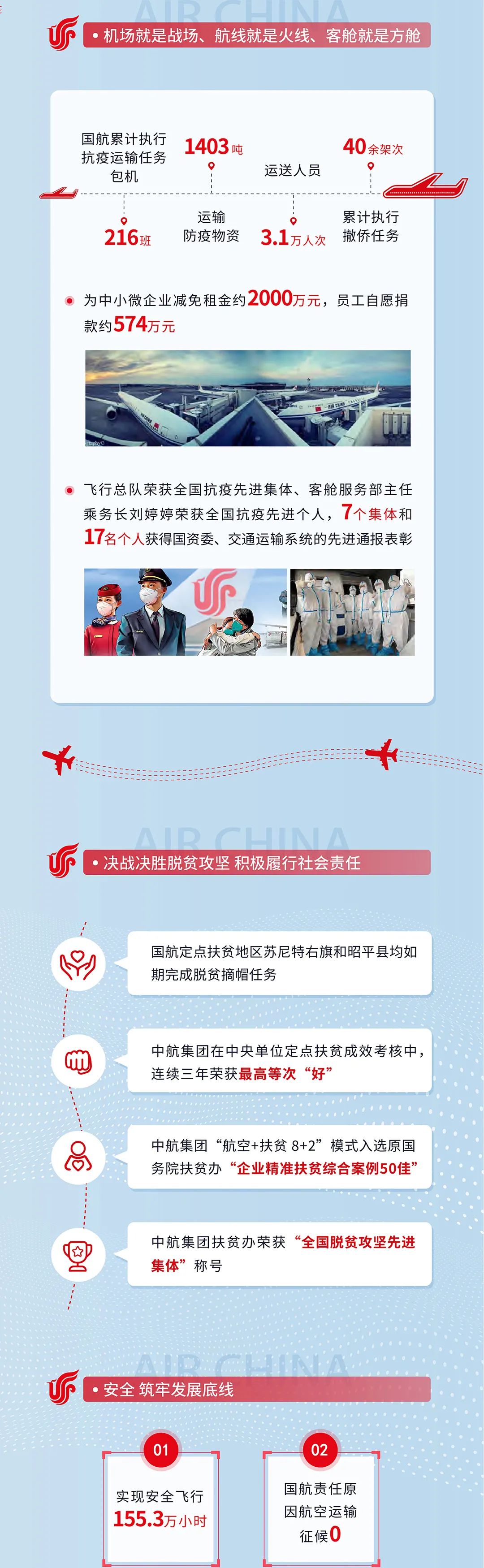 回首過去的一年, 我們在疫情防控、扶貧攻堅、安全飛行等方面, 展現(xiàn)出央企的責(zé)任與擔(dān)當(dāng)。 下面的一個個數(shù)字, 不僅是國航在2020年前行的足跡