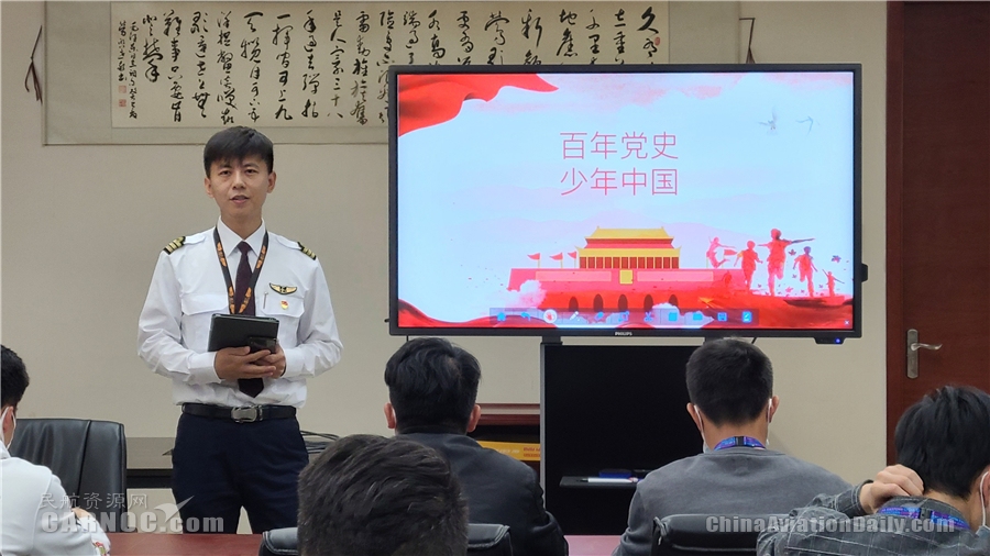 圖:東航云南公司一名青年飛行員在微黨課上分享黨史故事 東航供圖