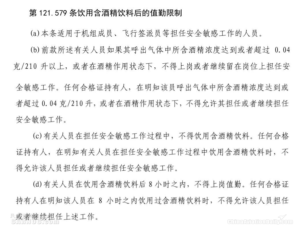 相關(guān)規(guī)定包括,機(jī)組成員、飛行簽派員等擔(dān)任安全敏感工作的人員,如果其呼出氣體中所含酒精濃度達(dá)到或者超過0.04克/210升以上,或者在酒精作用狀態(tài)下,不得上崗或者繼續(xù)留在崗位上擔(dān)任安全敏感工作。任何合格證持有人,在明知該員呼出氣體中所含酒精濃度達(dá)到或者超過0.04克/210升,或者在酒精作用狀態(tài)下,不得允許其擔(dān)任或者繼續(xù)擔(dān)任安全敏感工作。有關(guān)人員在飲用含酒精飲料后8小時之內(nèi),不得上崗值勤。