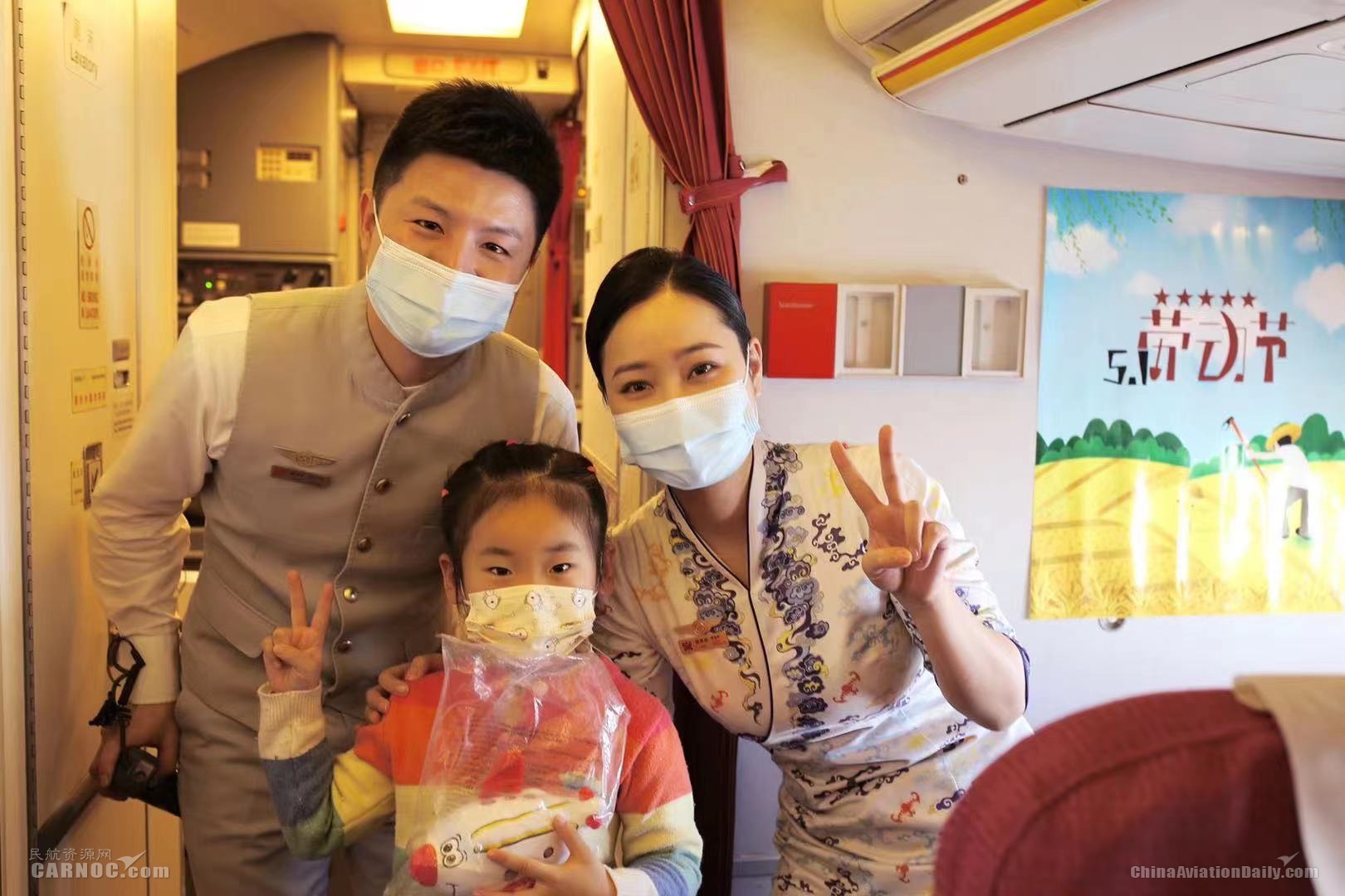 圖:乘務(wù)員與旅客在客艙內(nèi)歡度“五一” 海南航空供圖