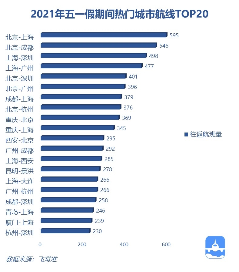 大數(shù)據(jù)顯示,假期間北京-上海成最熱門城市航線,北京-上海往返航班量595架次;其次是北京-成都往返航班量546架次、上海-深圳往返航班量498架次。