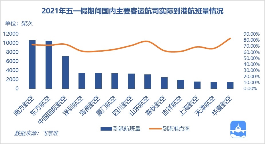航司方面,五一假期間,國內(nèi)主要客運航司實際到港航班量前三分別是南方航空、東方航空與中國國際航空。其中南方航空與東方航空實際到港航班量均超1萬架次以上,準(zhǔn)點率均在70%以上;主要客運航司中華夏航空到港準(zhǔn)點率最高,為82.92%。