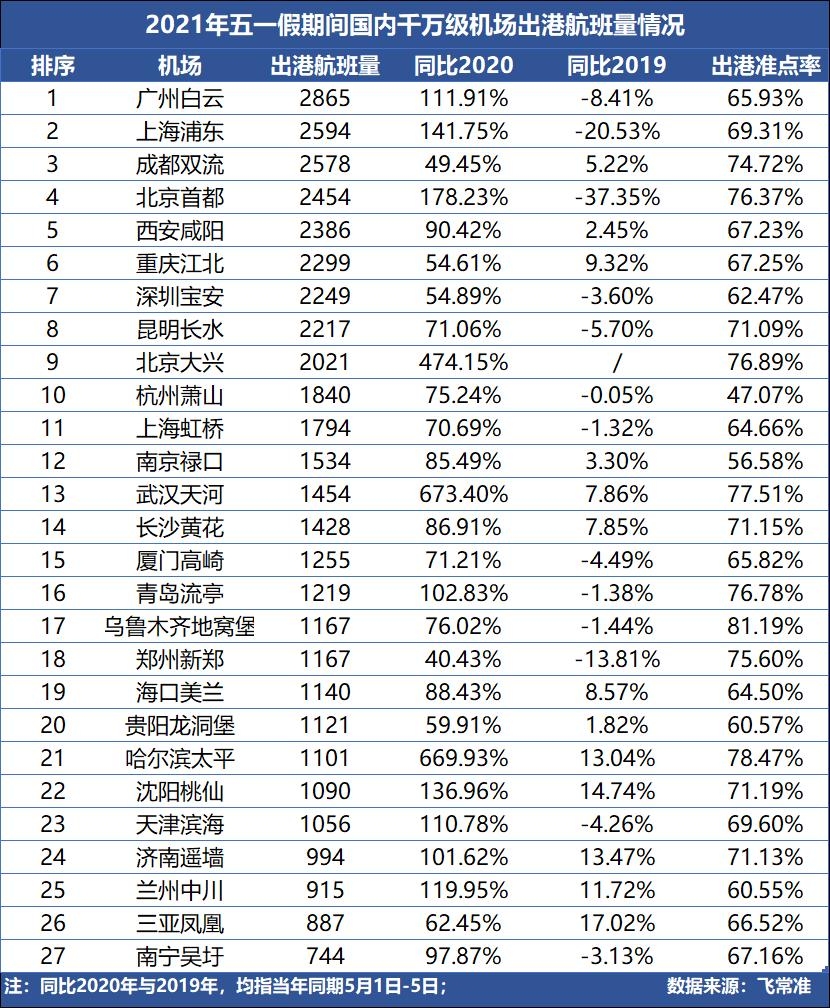 機場方面,五一假期間,國內(nèi)千萬級機場同比2020年出港航班量均實現(xiàn)同比正增長,其中廣州白云實際出港航班量排在首位。相比2019年同期,13家千萬級機場出港航班量超過疫情前同期水平。分別是三亞鳳凰、沈陽桃仙、濟南遙墻、哈爾濱太平、蘭州中川、重慶江北、海口美蘭、武漢天河、長沙黃花、成都雙流、南京祿口、西安咸陽、貴陽龍洞堡。其中三亞鳳凰機場相比2019年同期提升最多,出港航班量提升17.02%。