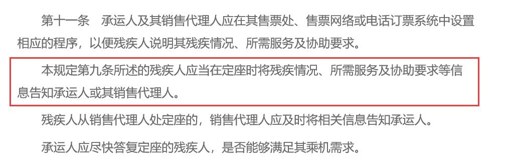管理辦法第十一條強調(diào),無陪伴人員的殘疾人,應(yīng)當(dāng)在定座時將殘疾情況、所需服務(wù)及協(xié)助要求等信息告知承運人或其銷售代理人。同時,承運人應(yīng)盡快答復(fù)定座的殘疾人,是否能夠滿足其乘機需求。