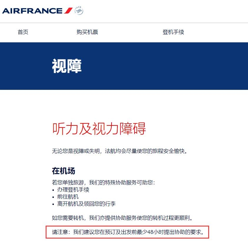 法國航空在其特殊協(xié)助服務(wù)中指出,對于單獨出行的聽力及視力障礙旅客,可以協(xié)助辦理登記手續(xù)、前往航班、離開航班及領(lǐng)取行李等幫助。法航建議旅客,在預(yù)訂及出發(fā)前最少48小時提出協(xié)助的要求。