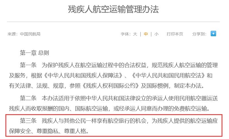 管理辦法明確指出,殘疾人與其他公民一樣享有航空旅行的機會,為殘疾人提供的航空運輸應(yīng)保障安全、尊重隱私、尊重人格。