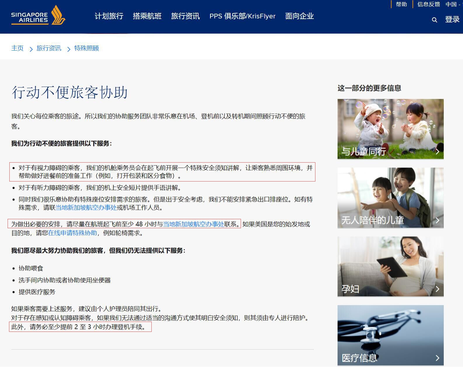 據(jù)了解,國際各大航空公司也都有類似國內(nèi)航司的針對殘疾旅客的服務(wù)須知。例如,新加坡航空在特殊旅客服務(wù)幫助中指出,對于行動不便的旅客,為做出必要的安排,請盡量在航班起飛前至少 48 小時與當(dāng)?shù)匦录悠潞娇辙k事處聯(lián)系。此外,新加坡航空要求行動不便的旅客務(wù)必至少提前2至3小時辦理登機手續(xù)。