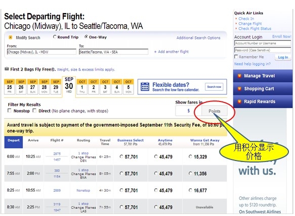 在西南航空公司官網(wǎng)查詢機(jī)票可以顯示用美元表示的價(jià)格與用積分表示的價(jià)格。2015年8月我們?cè)谖髂虾娇展俟揪W(wǎng)查詢了9月30日從芝加哥到西雅圖的航班信息,圖1和圖2分別是用美元和積分表示的部分航班的價(jià)格。