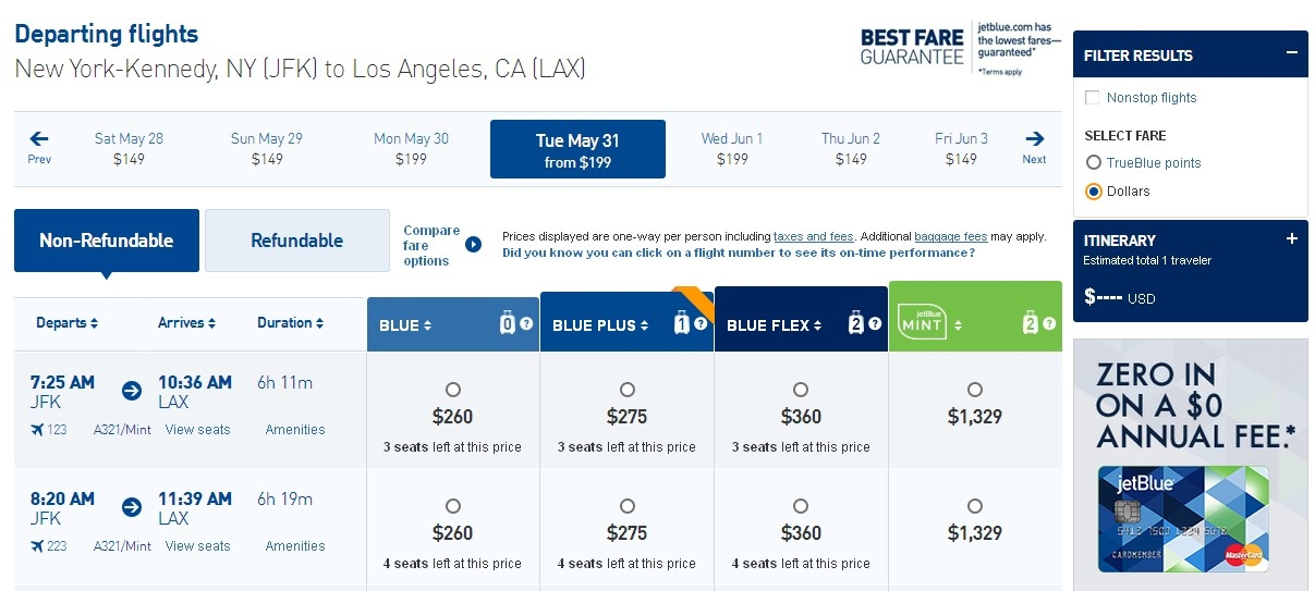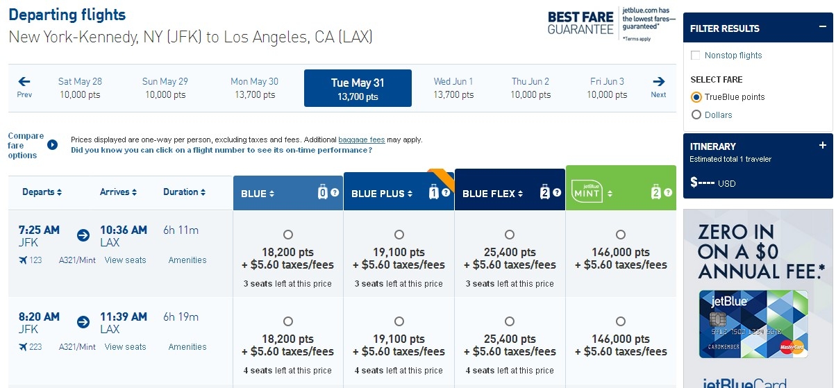 為了計(jì)算捷藍(lán)航空常旅客積分與貨幣之間的換算關(guān)系,我們2016年5月12日在捷藍(lán)航空官網(wǎng)上查詢了2016年5月31日紐約至洛杉磯的單程機(jī)票信息,圖4是用美元顯示的價(jià)格,圖5是用積分顯示的價(jià)格。通過對(duì)這些數(shù)據(jù)的計(jì)算分析可知,用積分購(gòu)買BLUE、BULE PLUS和BULE FLEX機(jī)票時(shí),大約65個(gè)積分相當(dāng)于1美元,用積分購(gòu)買MINT機(jī)票時(shí),大約105個(gè)積分相當(dāng)于1美元。