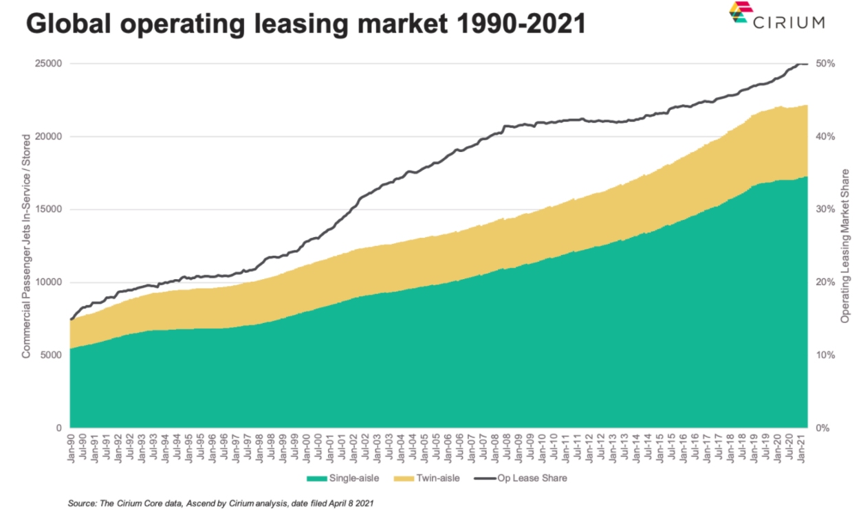 隨著飛機(jī)租賃商同時(shí)通過(guò)新飛機(jī)和二手飛機(jī)購(gòu)買(mǎi)回租向航空公司提供融資和流動(dòng)性,2020年初至今,經(jīng)營(yíng)性租賃占機(jī)隊(duì)市場(chǎng)份額比例從47.3%增長(zhǎng)至50%。