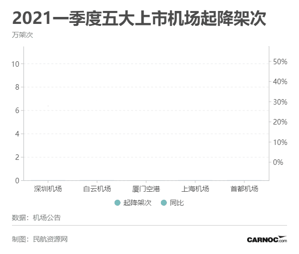 圖:2021年1-3月五大上市機場起降架次及同比 制圖:據(jù)