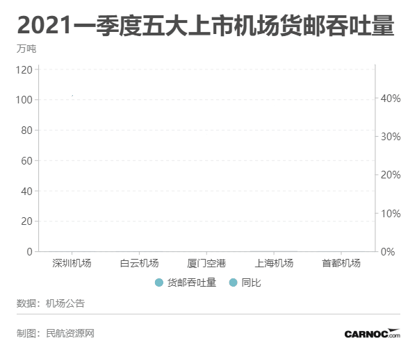 圖:2021年1-3月五大上市機場貨郵吞吐量及同比 制圖:據(jù)