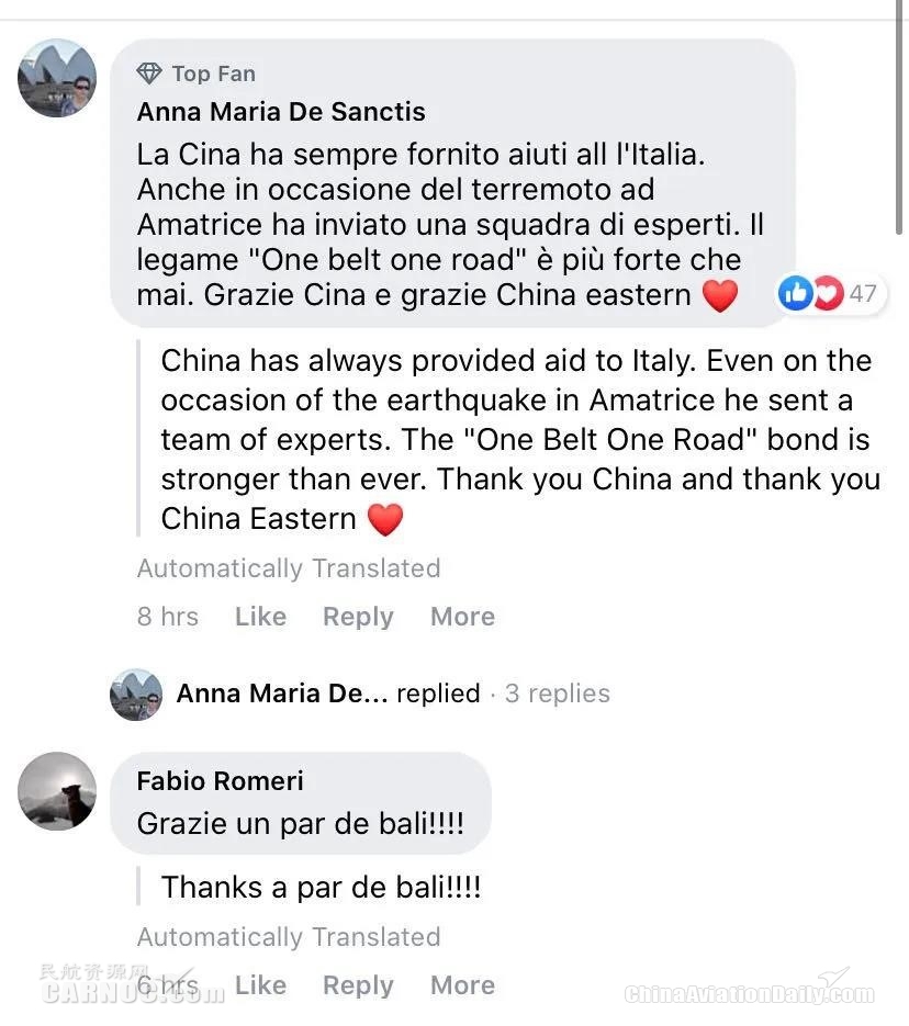 繼3月12日執(zhí)行MU787包機(jī)航班護(hù)送首批中國赴意大利抗疫專家組一行和防疫物資飛往羅馬的任務(wù)后,東航分別在3月18日和3月25日,兩次派包機(jī)運(yùn)送中國抗疫醫(yī)療專家組及有關(guān)抗疫物資馳援意大利。