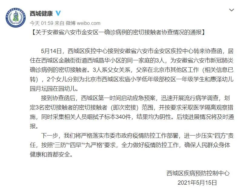 北京市西城區(qū)衛(wèi)生健康委員會15日凌晨通報(bào),5月14日,西城區(qū)疾控中心接到安徽省六安市金安區(qū)疾控中心轉(zhuǎn)來協(xié)查函,居住在西城區(qū)金融街街道西城晶華小區(qū)的同一家庭的3人,為安徽省六安市新冠肺炎確診病例的密切接觸者。