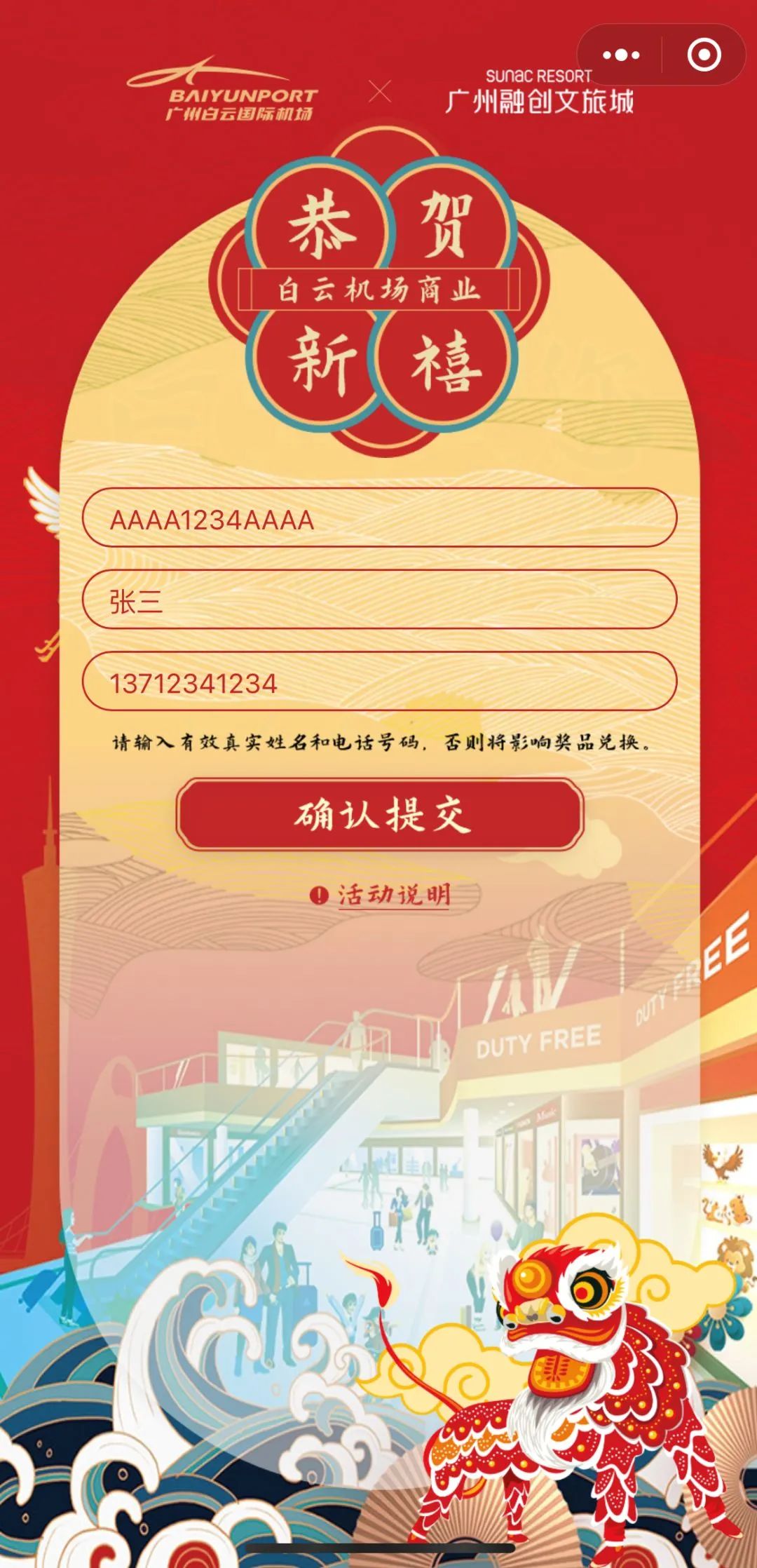 春節(jié)活動(dòng)期間,每位在白云機(jī)場(chǎng)一次性消費(fèi)滿100元的旅客,憑當(dāng)天有效進(jìn)出廣州登機(jī)牌及當(dāng)天機(jī)場(chǎng)購(gòu)物小票,可前往機(jī)場(chǎng)指定地點(diǎn)出示與登機(jī)牌姓名一致身份證兌換抽獎(jiǎng)刮刮卡。