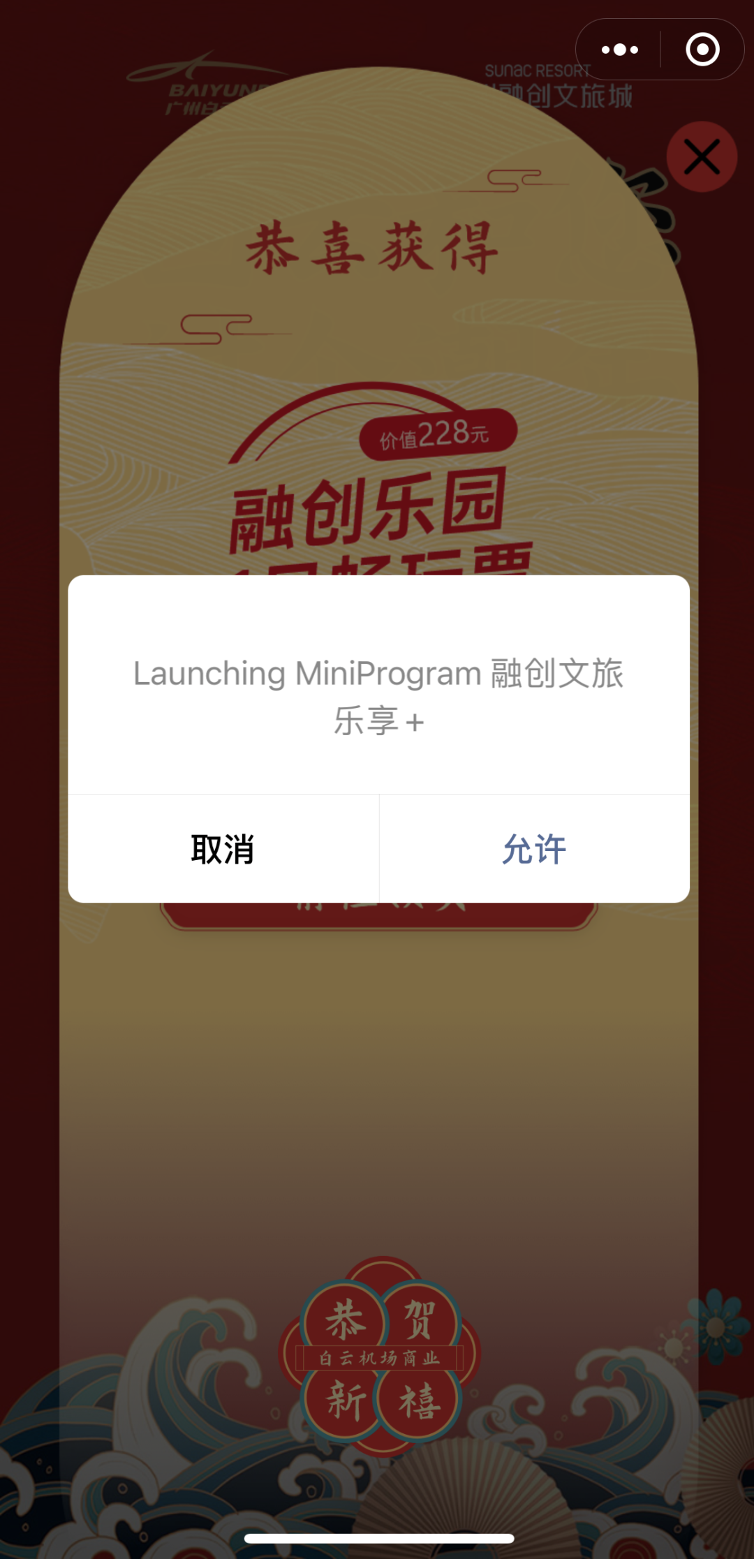 旅客掃描刮刮卡上二維碼,即可進(jìn)入白云機(jī)場(chǎng)小程序,輸入刮刮卡上抽獎(jiǎng)碼進(jìn)行抽獎(jiǎng)。如中獎(jiǎng),旅客點(diǎn)擊“立即領(lǐng)取”跳轉(zhuǎn)到融創(chuàng)小程序進(jìn)行線上領(lǐng)取電子券。