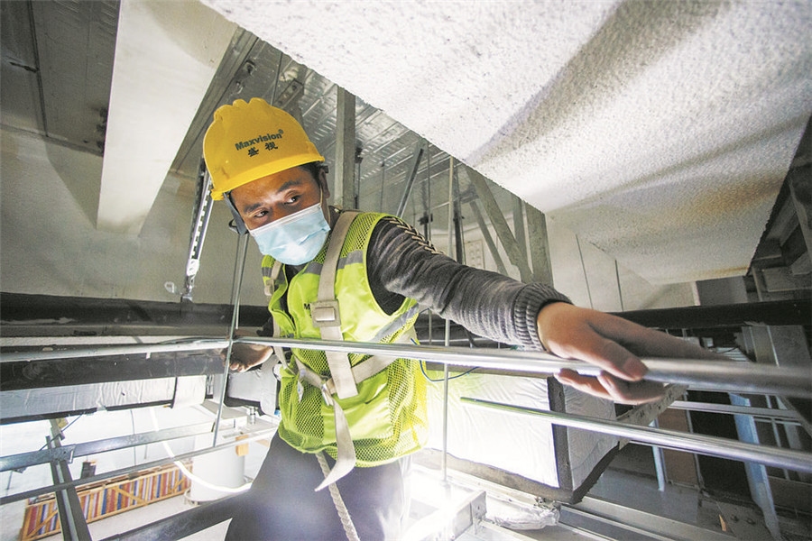 圖:工人在T1航站樓四層出發(fā)大廳內(nèi)安裝弱電設(shè)備