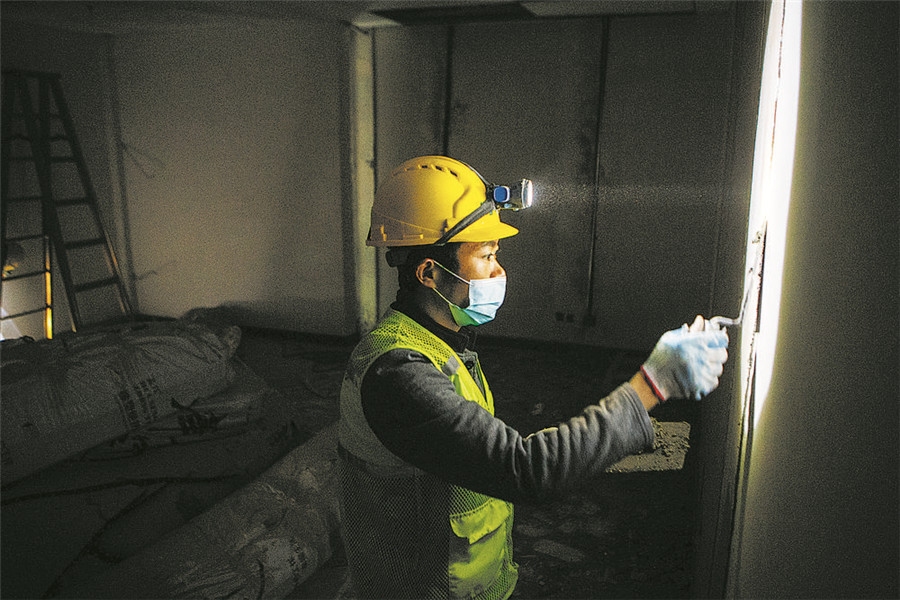 圖:工人在T1航站樓四層出發(fā)大廳內(nèi)安裝弱電設備